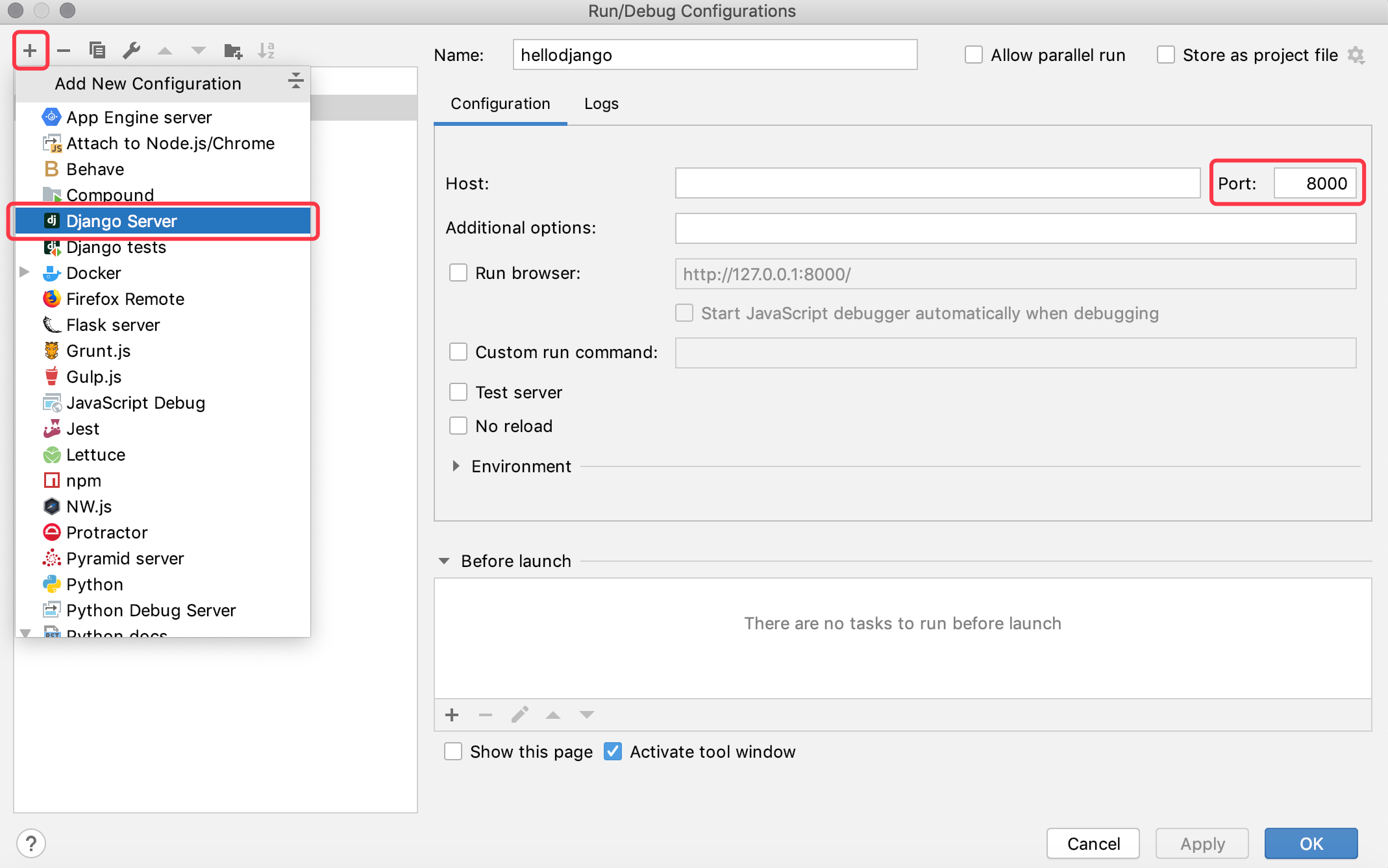 python manage.py runserver啟動服務器時,可以在後面添加參數來指定IP地址和端口號,默認情況下啟動的服務器將運行在本機的8000端口。- 在終端中運行的服務器,可以通過Ctrl+C來停止它 。通過PyCharm的“運行配置”運行的服務器直接點擊窗口上的關閉按鈕就可以終止服務器的運行。