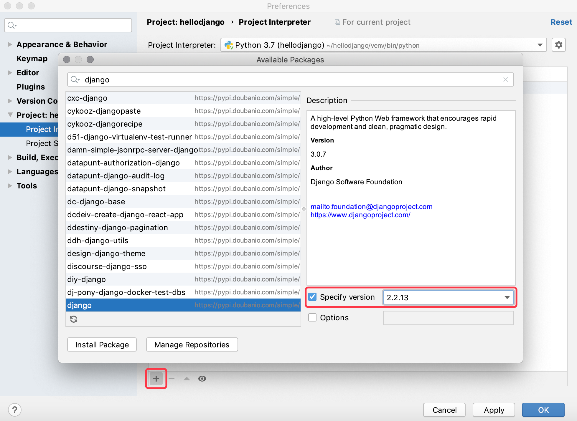 python命令對應的是Python 3的解釋器,而pip命令對應的是Python 3的包管理工具。pip install django==2.2.13方法二:在PyCharm的偏好設置中,可以找到項目的解釋器環境和已經安裝的三方庫,可以通過點擊添加按鈕來安裝新的依賴項,需要提醒大家的是在安裝Django依賴項時,需要指定版本號,否則將默認安裝更新本文時最新的3.0.7版本。