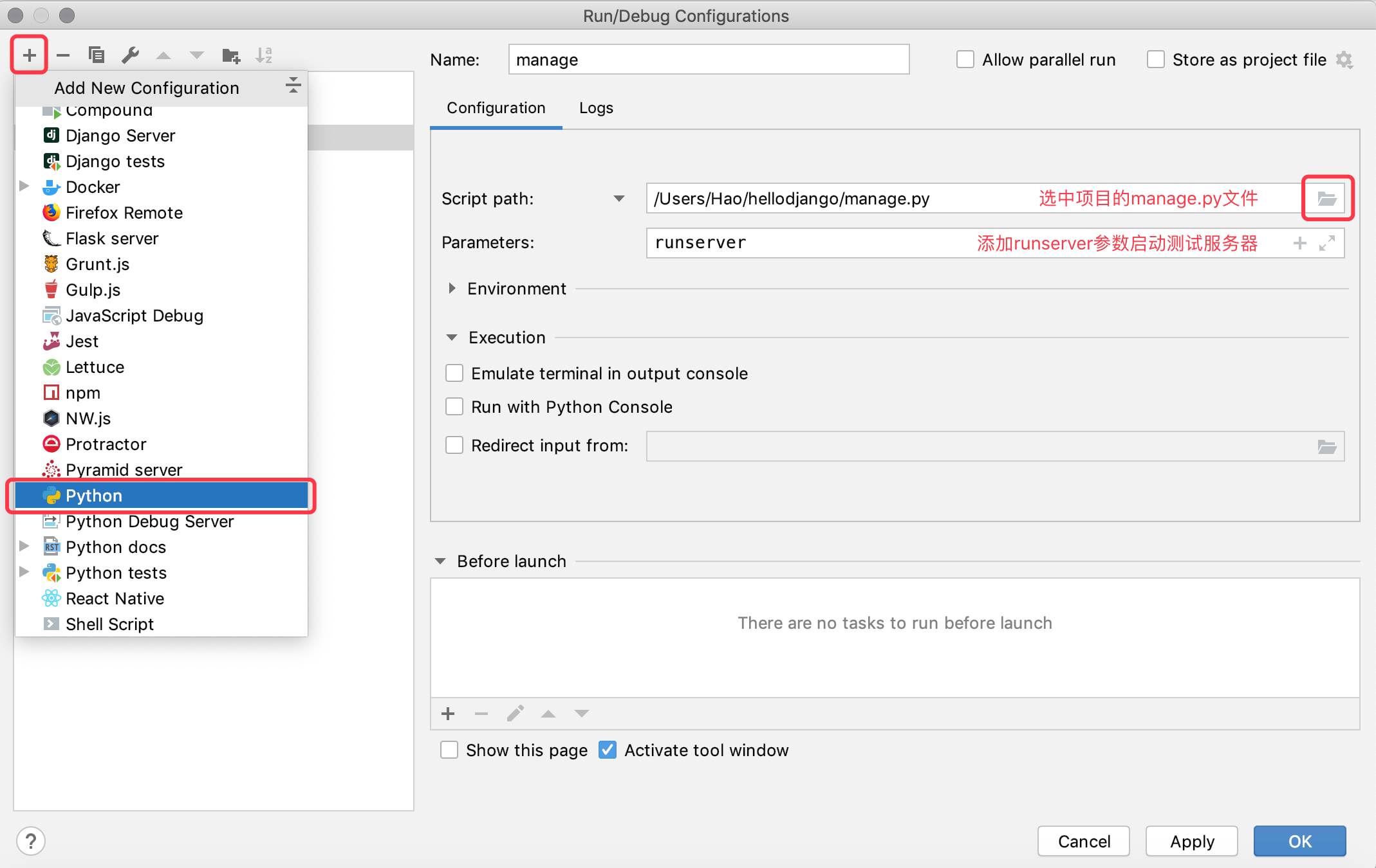 方法一:在“Run”菜單選擇“Edit Configuration”,配置“Django server”運行項目(適用於專業版PyCharm)。