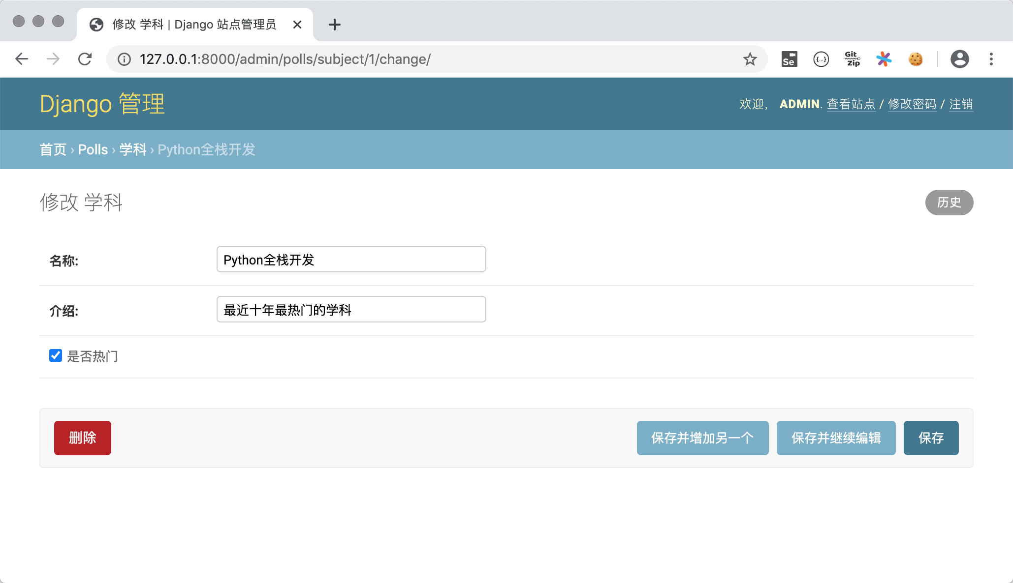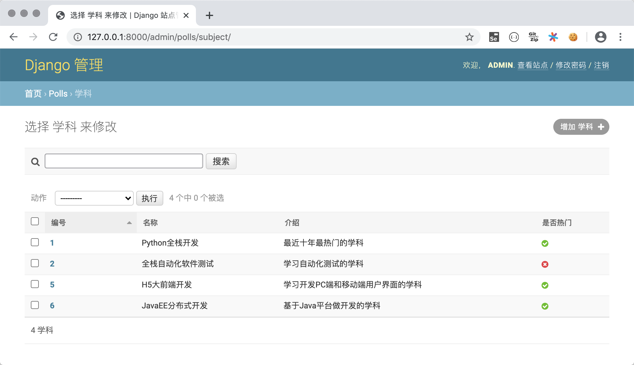 subject3 = Subject(name='JavaEE分布式開發', intro='基於Java語言的服務器應用開發', is_hot=True)