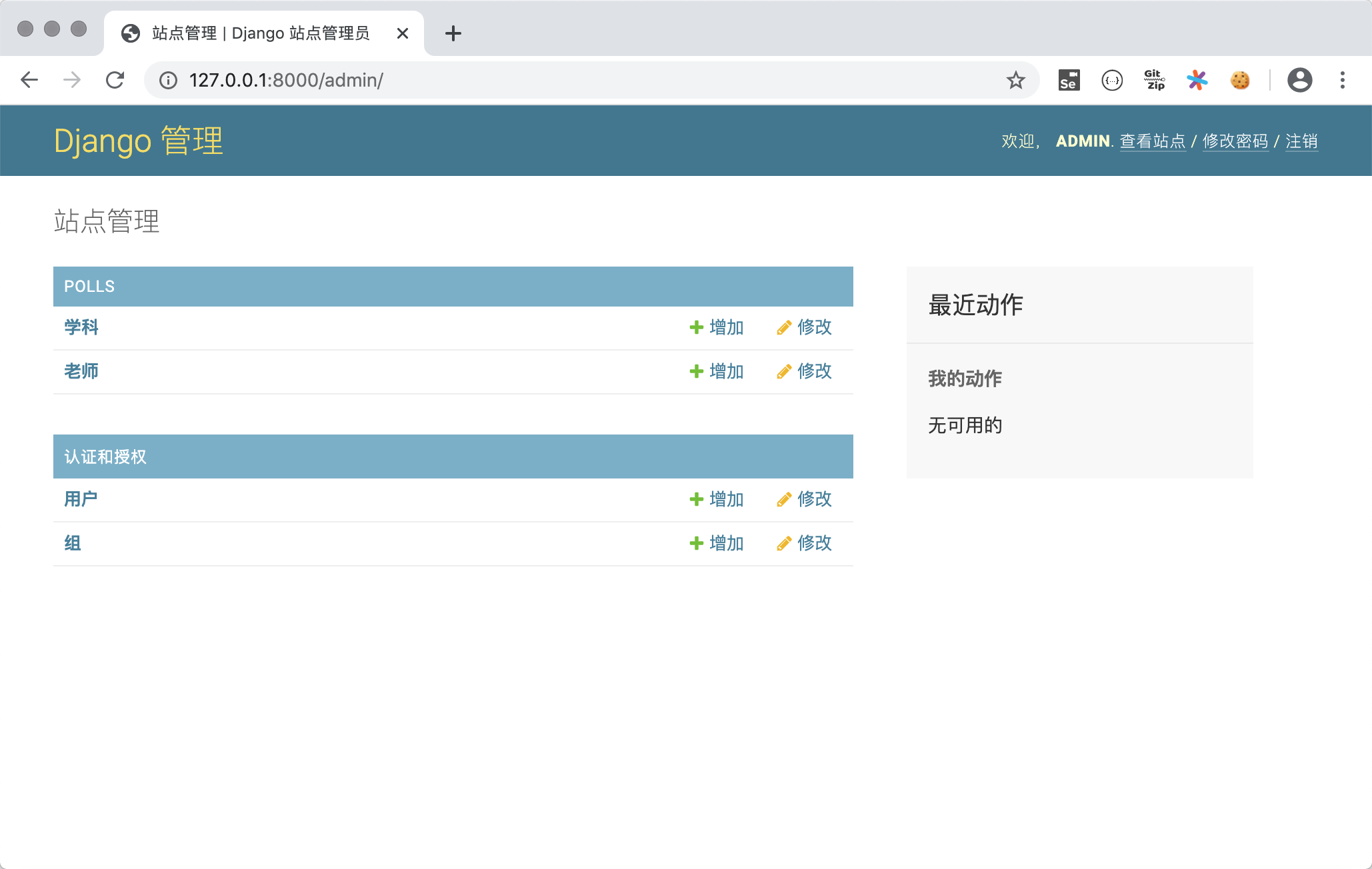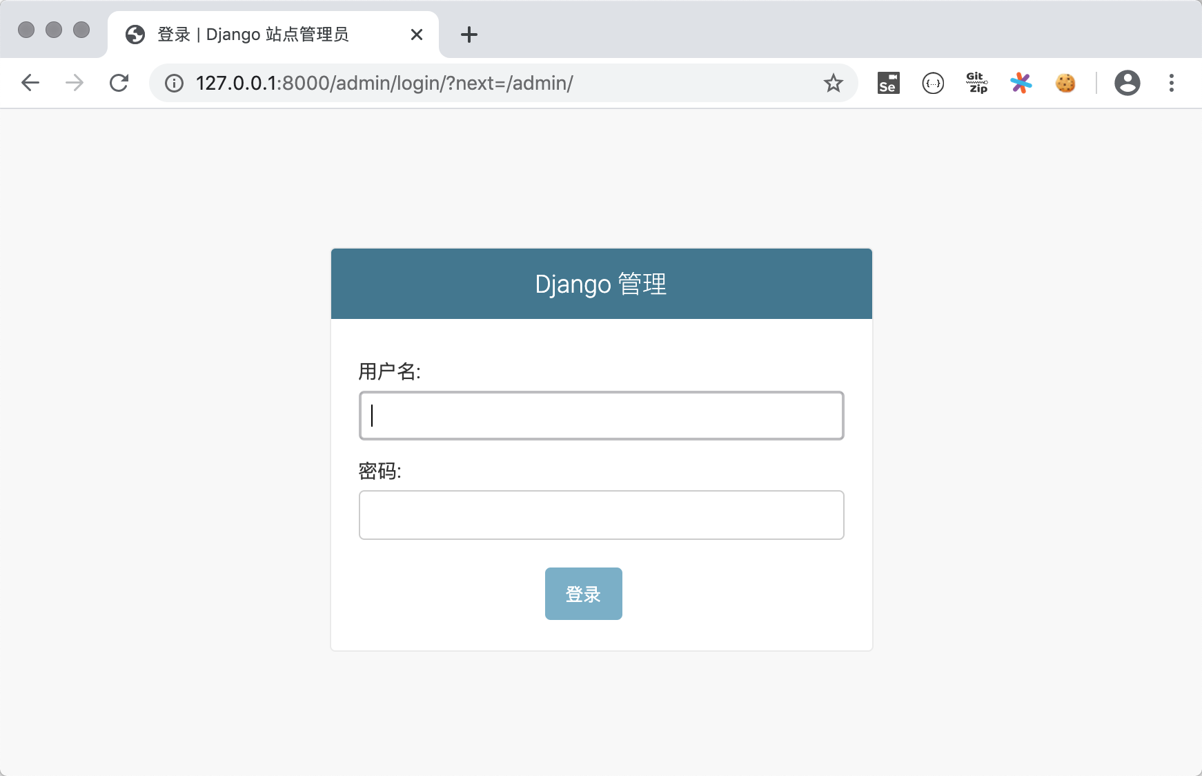 http://127.0.0.1:8000/admin,輸入剛才創建的超級用戶賬號和密碼進行登錄。