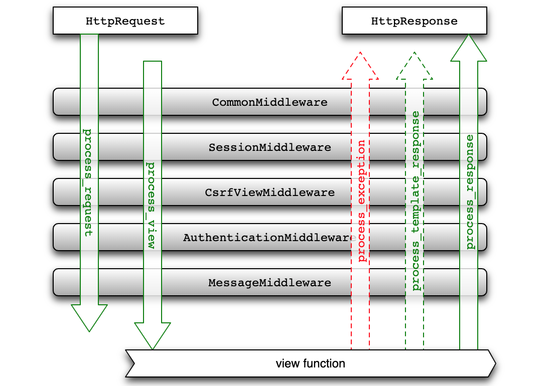 注意上面這個中間件列表中元素的順序,當收到來自用戶的請求時,中間件按照從上到下的順序依次執行,這行完這些中間件以後,請求才會最終到達視圖函數。當然,在這個過程中,用戶的請求可以被攔截,就像上面我們自定義的中間件那樣,如果用戶在沒有登錄的情況下訪問了受保護的資源,中間件會將請求直接重定向到登錄頁,後面的中間件和視圖函數將不再執行。在響應用戶請求的過程中,上面的中間件會按照從下到上的順序依次執行,這樣的話我們還可以對響應做進一步的處理。
